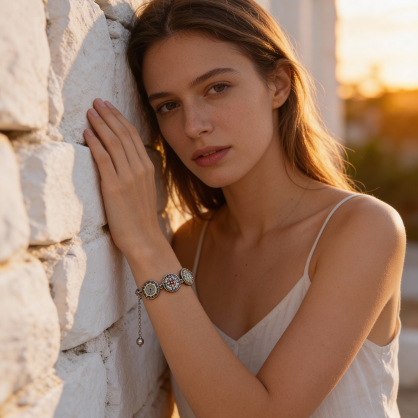 Add a pop of vibrant charm to your wrist with our Triple Bezel Bracelet. Each bezel showcases a one-of-a-kind Mexican tile design, sealed beneath a glossy glass cabochon. The tiles are set in a sleek, subtly plated bracelet finished with an easy-to-adjust slip-knot clasp. Effortlessly stylish, this bracelet is the perfect way to brighten any outfit and add a splash of color to your day.