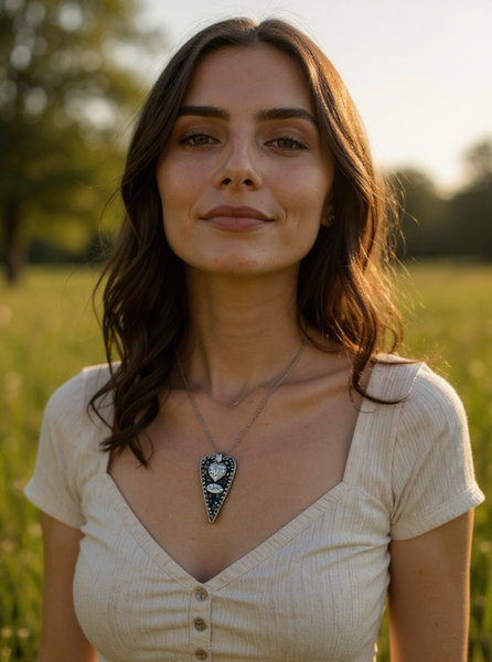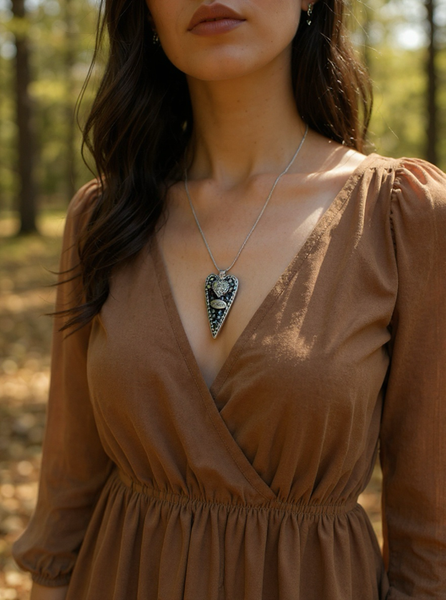 This beaded mosaic heart pendant features a heart-shaped bezel adorned with silver beads and sparkling black crystals. It also includes a heat charm and an engraved "believe" charm. Perfect for those who value both style and meaning.